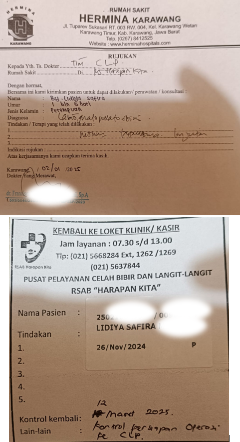 My name is Tias Adiyatna, and I am the father of Lidiya Safira Miyuki, our first and only daughter. She was born with cleft lip and cleft palate, which makes it difficult for her to eat, speak, and breathe normally.
